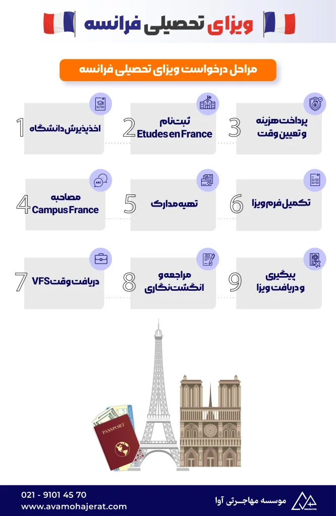 تحصیل در کشورهای پیشرفتهای مانند فرانسه آرزوی بسیاری از افراد است. شاید شما نیز به فکر دریافت ویزای تحصیلی این کشور افتاده باشید؛ اما باید توجه کنید که شرایط تحصیل در کشورهای مختلف دائماً در حال تغییر است و شما باید اطلاعات کافی و به روزی در این زمینه داشته باشید. برای دریافت ویزای تحصیلی فرانسه، حتماً باید دانش کافی در مورد شرایط و مراحل آن داشته باشید. موسسه مهاجرتی آوا مشاوره تخصصی و حرفهای در زمینه مهاجرت ارائه میدهد و میتواند به شما در اخذ ویزاهای توریستی و تحصیلی کمک کند.